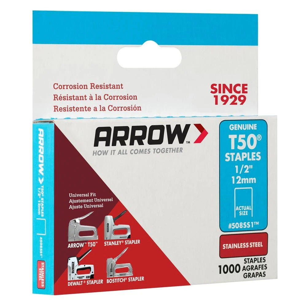 Arrow 508SS1 T50 1/2 in. (12 mm) Stainless-Steel staples are genuine Arrow Fasteners. Made of heavy duty, corrosion resistant steel, these staples will last you a long time and will hold your fabric, padding, wiring and anything else secure. A unique item on the market the Stainless-steel staples are designed to not only look nice wherever they are used but also resist the effects of tarnishing and rust. The T50 staples feature extreme versatility as they can fit many different stapler models. They can be used for light and heavy duty home projects such as installing window screening, upholstering furniture, attaching insulation and pinning down wire. Other uses include roofing felt, house wrap, weather stripping and carpeting.