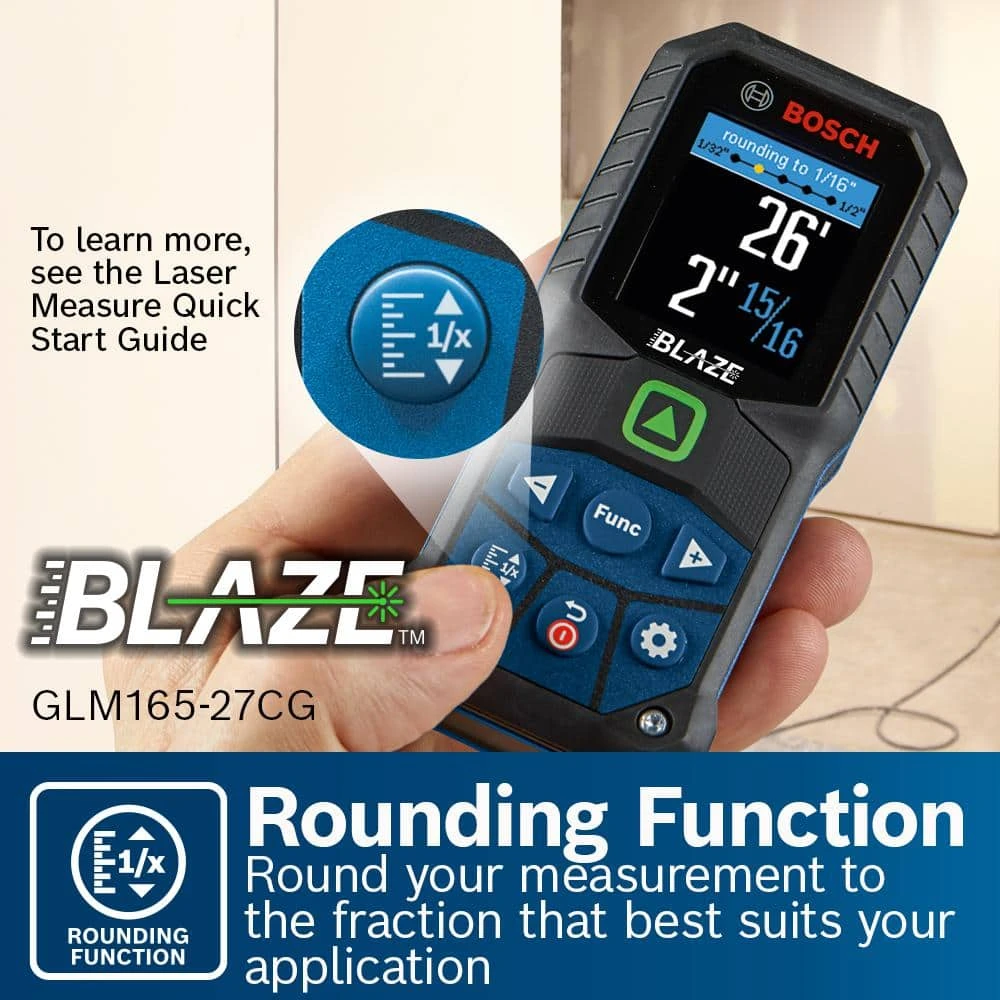 This 165 ft. green-beam laser measure is a fully featured tool with an easy-to-read color display, great accuracy, an inclinometer for tilt angle and reinforced housing for durability. The Bosch BLAZE GLM165-27CG uses Green-beam technology, which generates lines up to 4X brighter than standard red beams. The inclinometer shows the tilt angle up to 360° for easy angle and indirect measurements. The laser has accuracy up to plus minus 1/16 in., plus it includes a rounding button for easily rounds results and haptic feedback for loud jobsites. The digital laser measure also offers Bluetooth functionality, so users can digitally transfer measurements to a smartphone or tablet through the free MeasureOn app. It also has full rubber over mold housing, designed to be similar to a roll cage. It is IP65 rated and has an ergonomic design for better grip. It includes 11 different measuring functions, including real-time length, area, volume and indirect functions, and addition/subtraction capability.