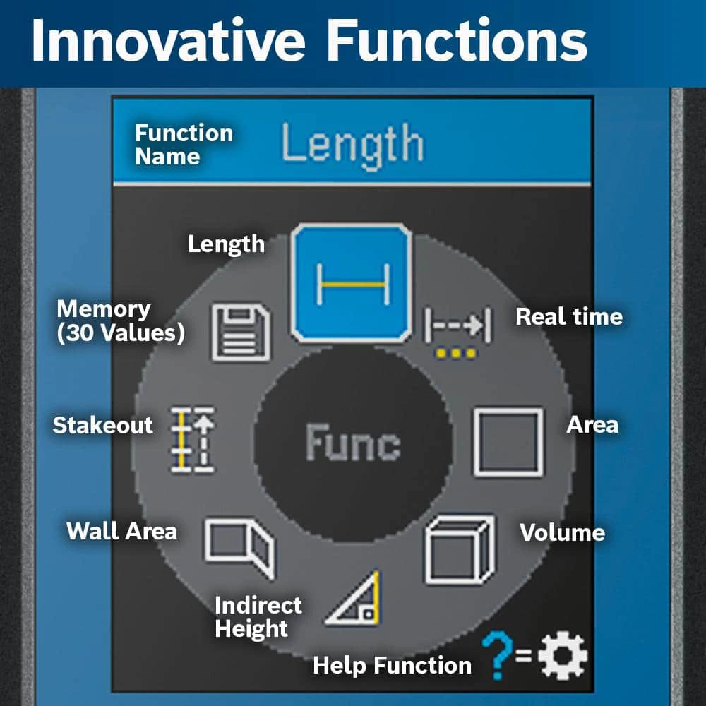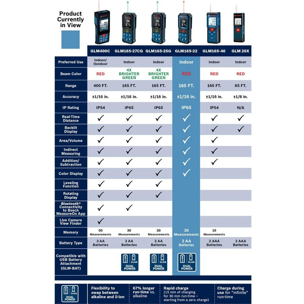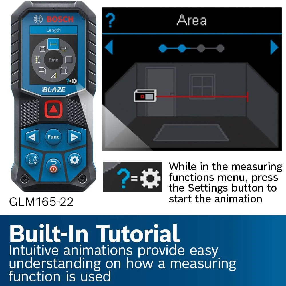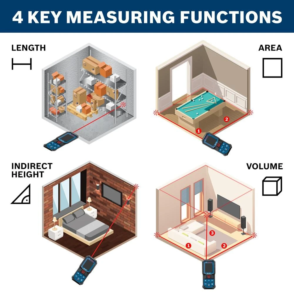 This 165 ft. laser measure is a fully featured tool with an easy-to-read color display, great accuracy and reinforced housing for durability. The Bosch BLAZE GLM165-22 has accuracy up to plus minus 1/16 in., plus it includes a rounding button for easily rounds results and haptic feedback for loud jobsites. The digital laser measure also offers full rubber over mold housing, designed to be similar to a roll cage. It is IP65 rated and has an ergonomic design for better grip. It has default real-time measurement mode, which immediately provides accurate measuring that automatically adjusts closer to or farther from the target. It includes 11 different measuring functions, including real-time length, area, volume and indirect functions and addition/subtraction capability.