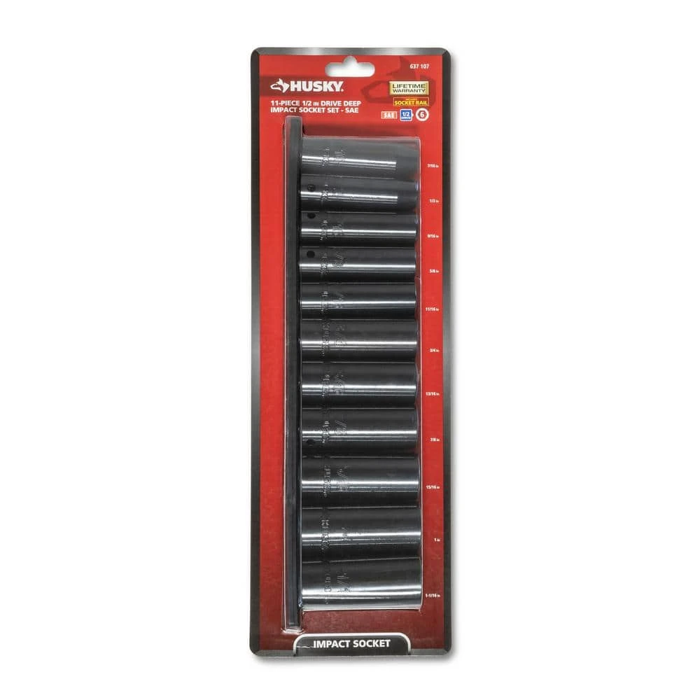 The Husky 1/2 in. Drive Deep SAE Impact Socket Set contains 11 deep 6-point SAE impact sockets. The Husky 1/2 in. drive deep impact socket set features sockets that are forged from chrome molybdenum alloy steel (Cr-Mo) and designed to withstand rigors of heavy duty auto and industrial use. Size markings have been hard stamped into the sockets for quick and easy identification that will never wear away. These impact sockets also feature off-corner loading which helps prevent fastener rounding, plus a pin hole at the base of each socket for use with pin and O-ring for a secure attachment to drive tools. An oiled, black oxide finish gives you maximum corrosion resistance. This 11-piece Husky deep impact socket set is perfect for both the professional mechanic’s or the DIYer’s garage.