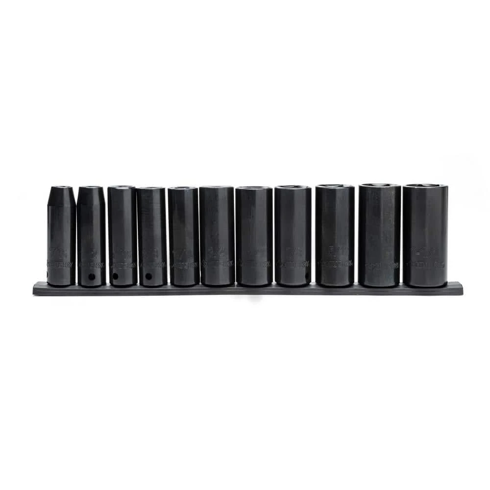 - The 1/2 in. deep impact socket set includes (11) 1/2 in. drive deep impact sockets: SAE – 7/16, 1/2, 9/16, 5/8, 11/16, 3/4, 13/16, 7/8, 15/16, 1, 1-1/16 in