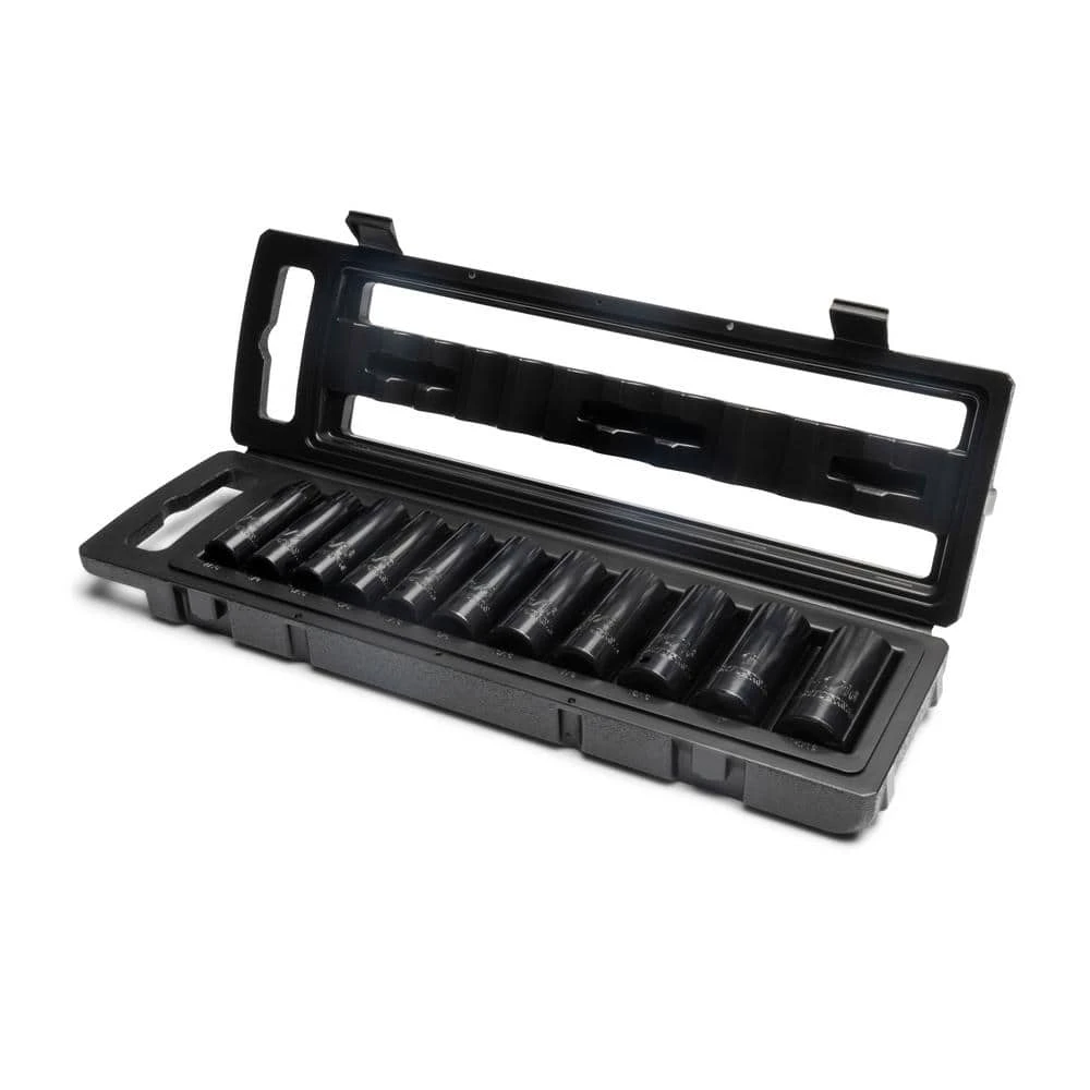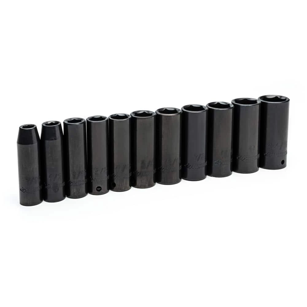 - 1/2 in. D impact socket set includes (11) 1/2 in. drive deep impact sockets: SAE – 7/16, 1/2, 9/16, 5/8, 11/16, 3/4, 13/16, 7/8, 15/16, 1, 1-1/16 in