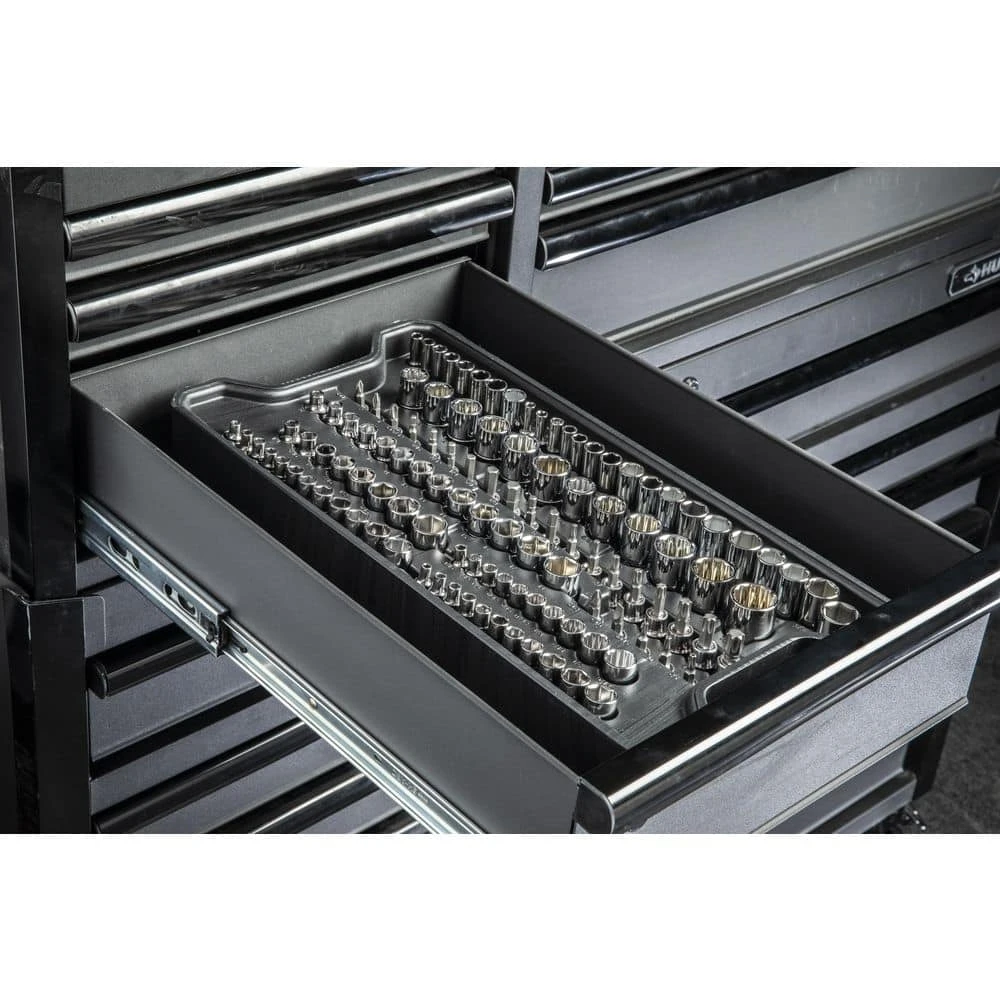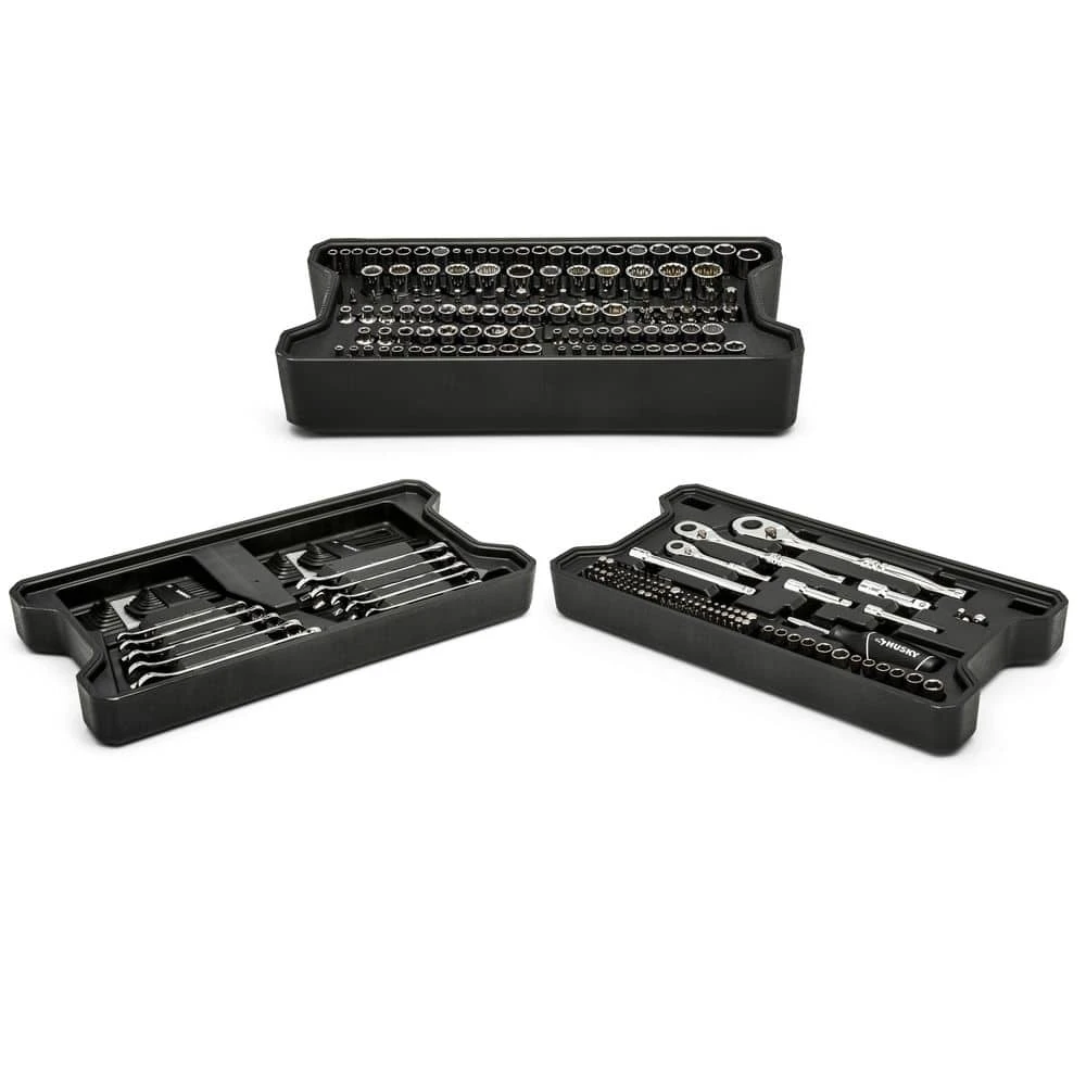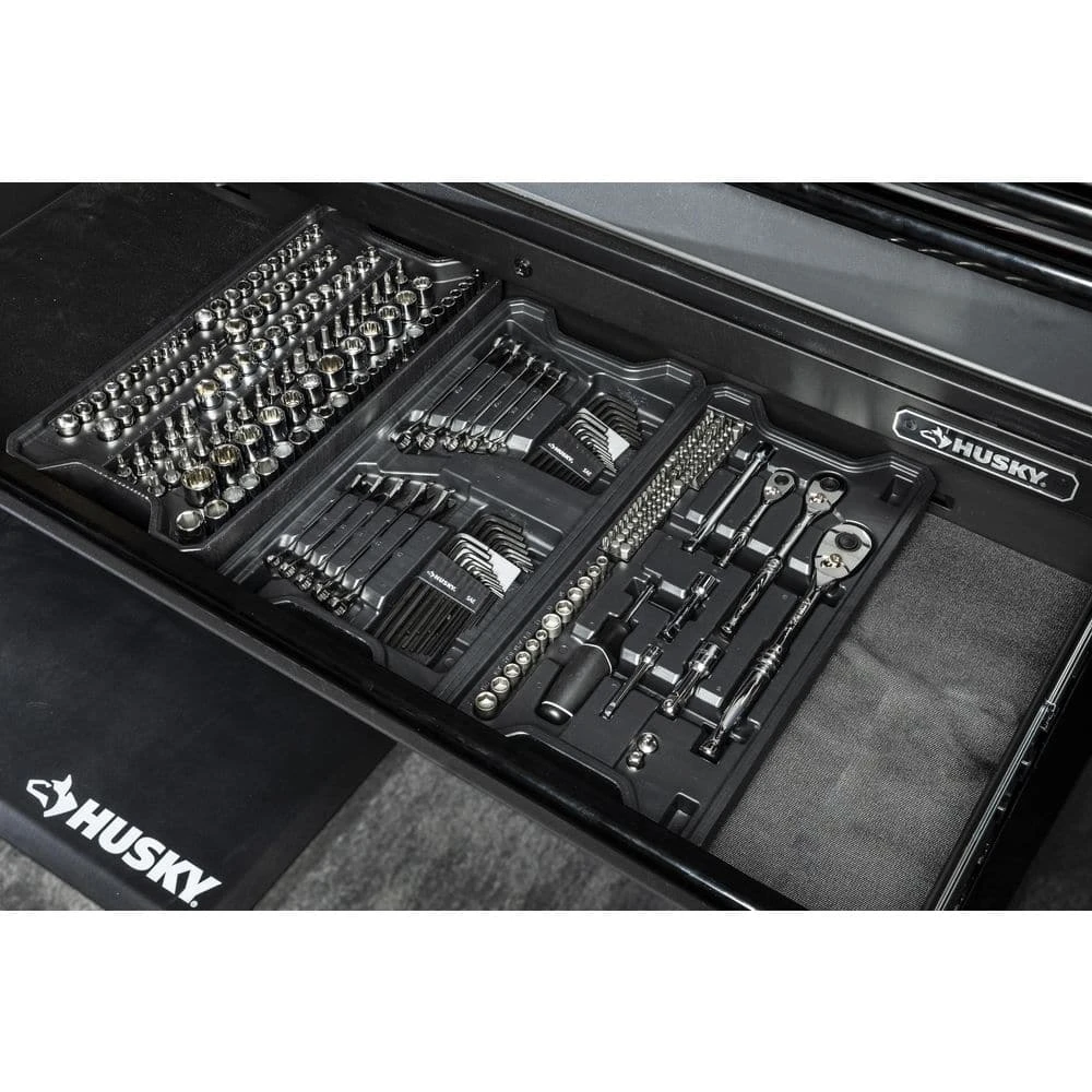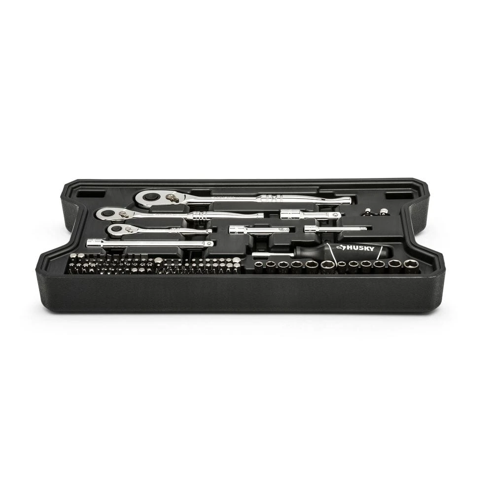 The Husky 270-piece 1/4 in, 3/8 in. and 1/2 in. drive Mechanic’s Tool Set offers a comprehensive selections of tools for the professional or DIY mechanic’s workshop. The 91 different standard and deep sockets, along with the 10 combination wrenches and 24 bit sockets, will allow you to tackle any fastening or repair project. This Husky 270-piece tool set will provide the novice or professional with a huge assortment of durable and reliable tools to get the job done.