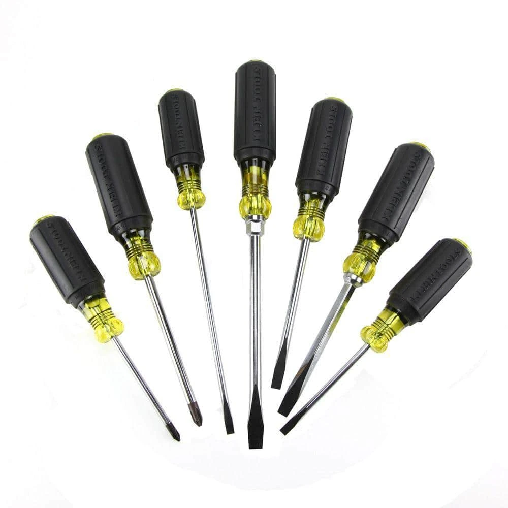 Get the job done with this 7-piece assorted screwdriver set. Designed with the most common screwdriver tips, it offers three cabinet, two Phillips and two keystone tip screwdrivers. Cushion-grip handles make them comfortable, and Tip-Ident allows fast identification of the kind of screwdriver and the tip orientation. Chrome plating delivers corrosion resistance for durability.