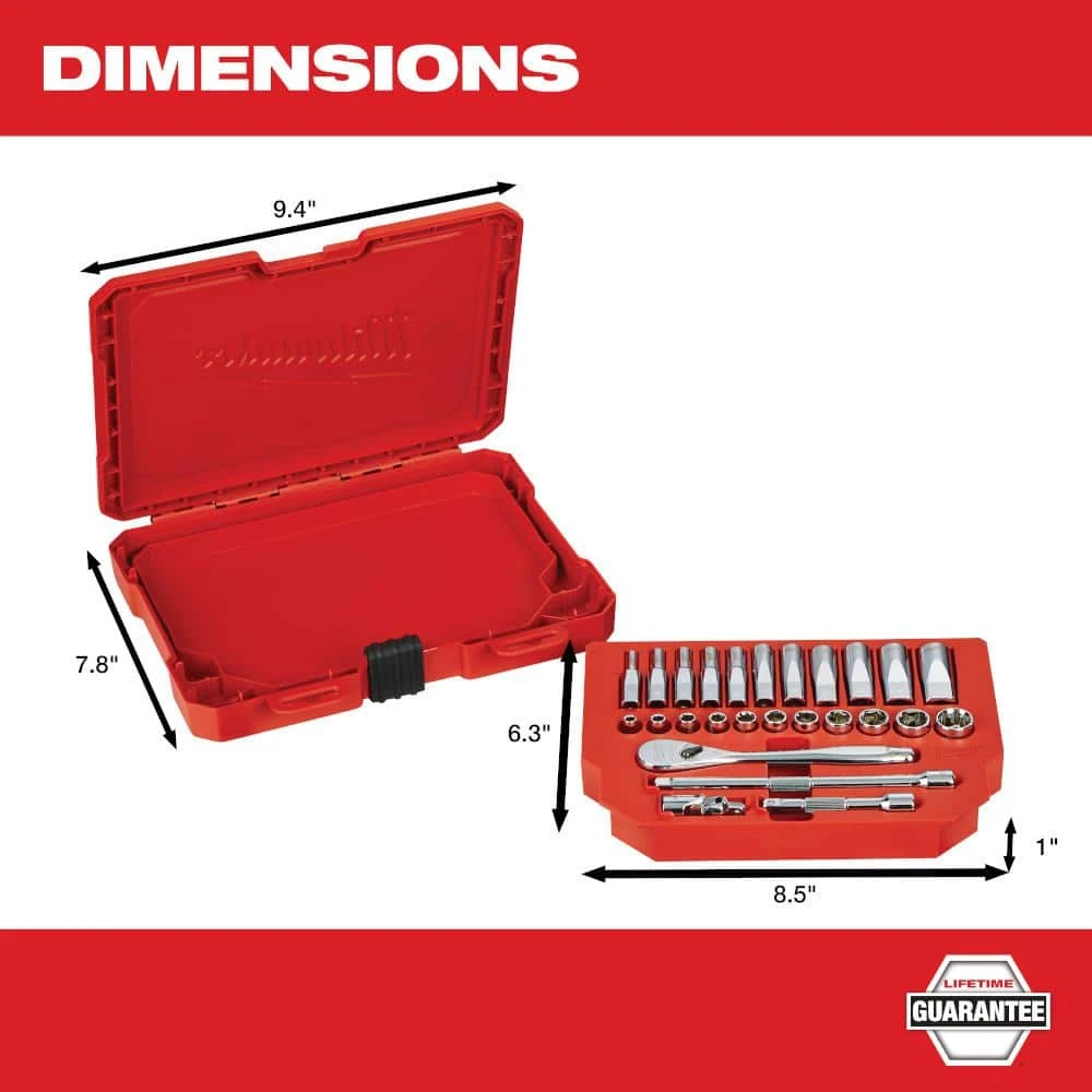 The MILWAUKEE SAE 26 piece 1/4 in. drive ratchet & socket set was designed from the ground up to offer better access in tight spaces and maximum tool strength. The 90-tooth ratchet tool offers 4 degrees of arc swing and a slim profile design, allowing work in tighter spaces. Innovative socket design has four parallel flats, which deter rolling and are wrench-compatible. Optimized socket geometry helps reduce bolt rounding and stripping. Socket sizes are stamped into the flats for improved easy-to-read visibility. the ratchet and socket kit comes with a removable inner tray, designed to be stored long-term in a steel storage chest. It also comes with a durable carrying case for ultimate portability. The set comes with accessories included and a Mechanics Hand Tools Lifetime Guarantee.