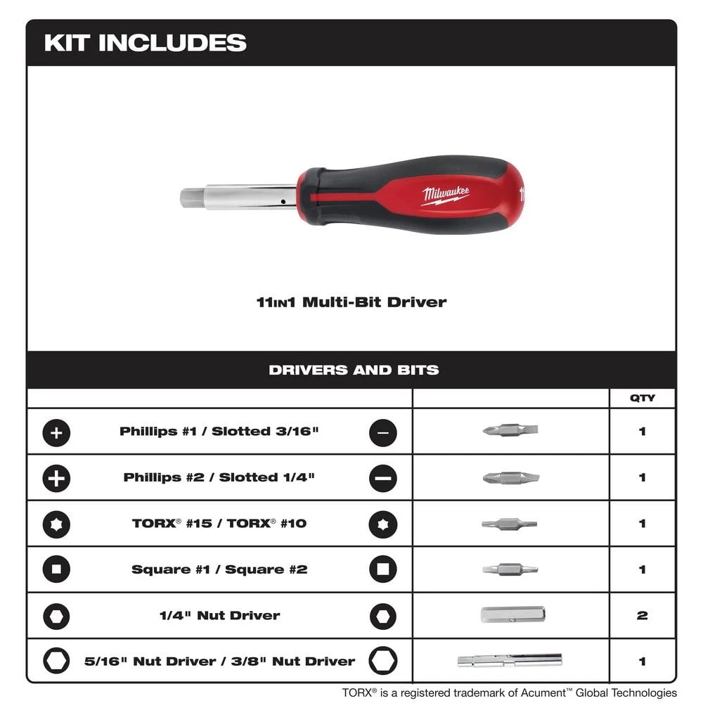 - Use the Milwaukee 11-in-1 multi-tip screwdriver for a wide variety of driving needs