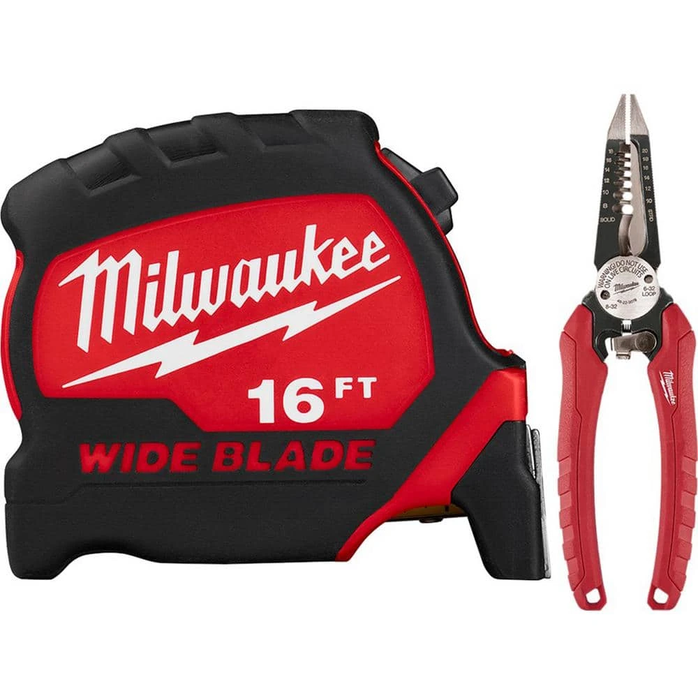 - Kit includes: one 48-22-0216 16 ft. x 1.3 in. wide blade tape measure and one 48-22-3079 combination electricians 6-in-1 wire strippers pliers