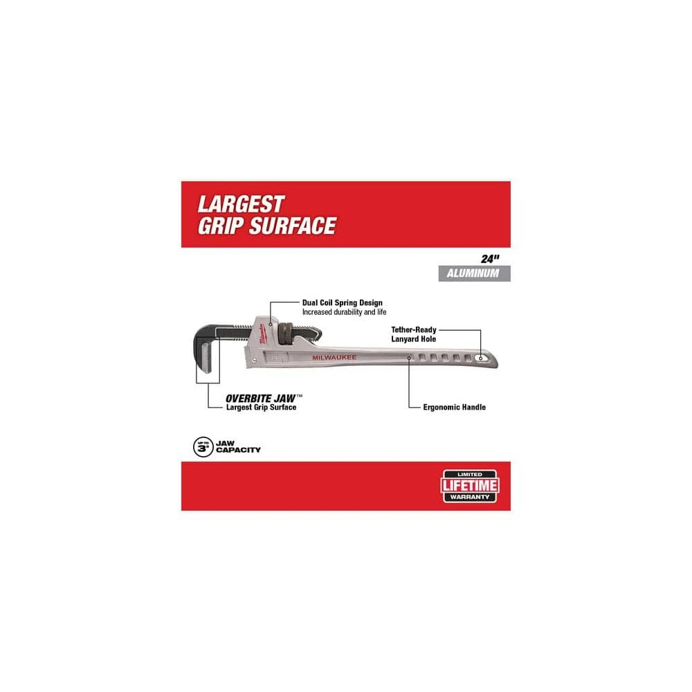 - Includes: (one) 18 in. aluminum pipe wrench (48-22-7218) and (one) 24 in. aluminum pipe wrench (48-22-7224) two-pack
