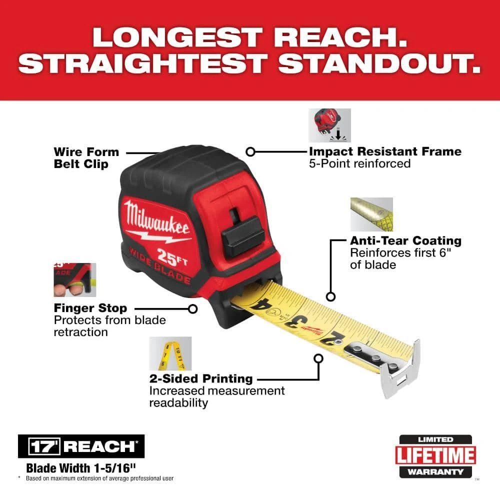 The Milwaukee 25 ft. Wide Blade Tape Measures have the longest reach and straightest standout in the industry. Users can reach further on the jobsite with up to 17 ft. of reach to take long measurements on their own. The Milwaukee blade design provides the straightest standout, reducing blade arc for efficient and accurate measuring.. The tape measures are wear and impact-resistant with nylon bond blade protection and an additional anti-tear coating on the first 6 in. of the blade, reducing tape tear. Built to withstand the jobsite, the measuring tapes are constructed with a 5-point reinforced frame for impact resistance.