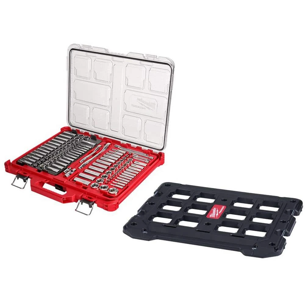 - Includes: one 56-piece 3/8 in. drive ratchet and socket set (48-22-9008), one 50-piece 1/4 in. drive ratchet and socket set (48-22-9004), 1 PACKOUT compact organizer (48-22-8436), and 1 PACKOUT mounting plate (48-22-8485)