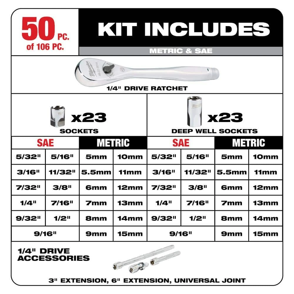 - Included: 56-piece 3/8 in. Drive Ratchet and Socket Set (48-22-9008), 50-piece 1/4 in. Drive Ratchet and Socket Set (48-22-9004), and PACKOUT Low-Profile Organizer (48-22-8431)