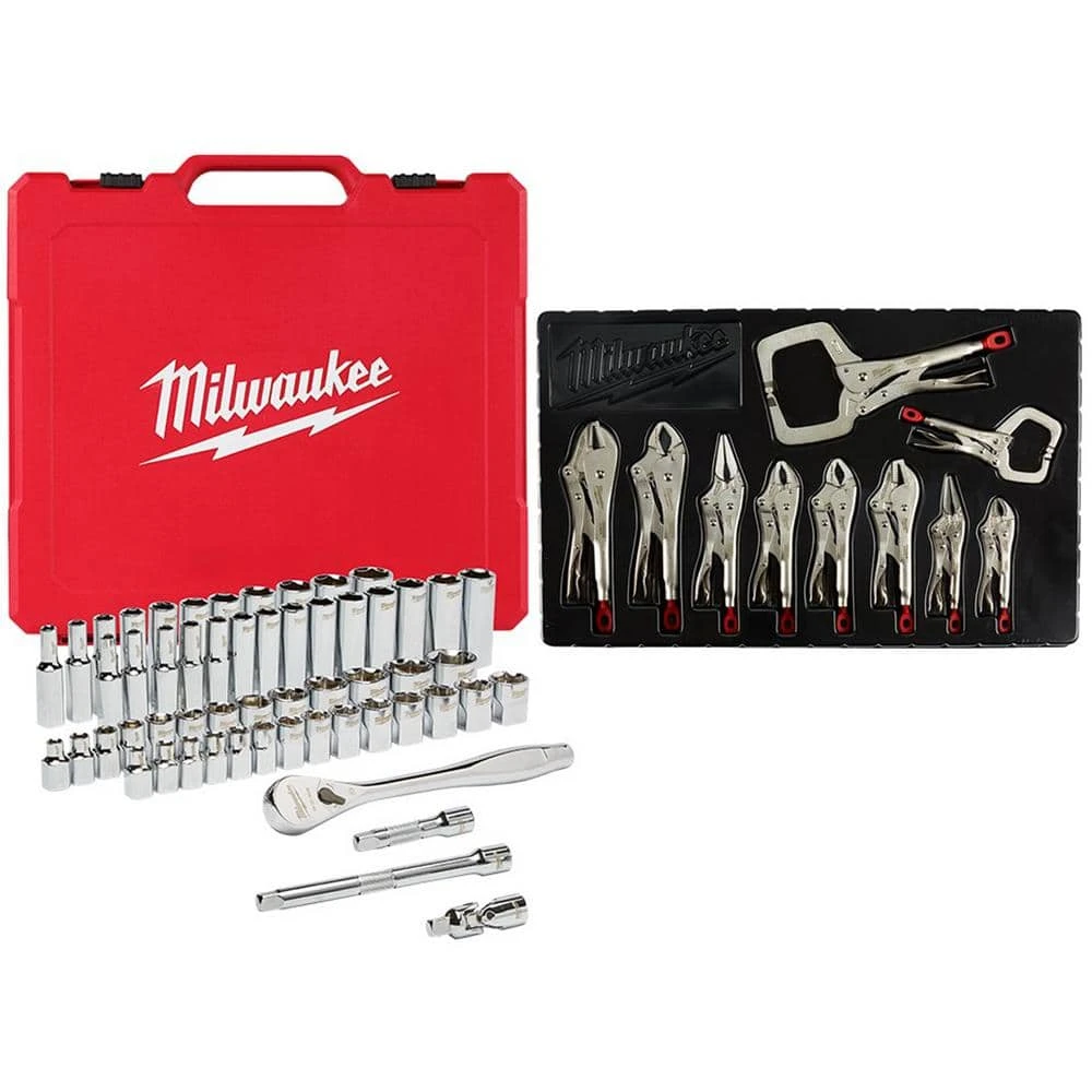 - Includes: (1) 56-piece 3/8 in. drive SAE/metric ratchet and socket mechanics tool set (48-22-9008) and (1) 10-piece torque lock locking pliers kit (48-22-3690)