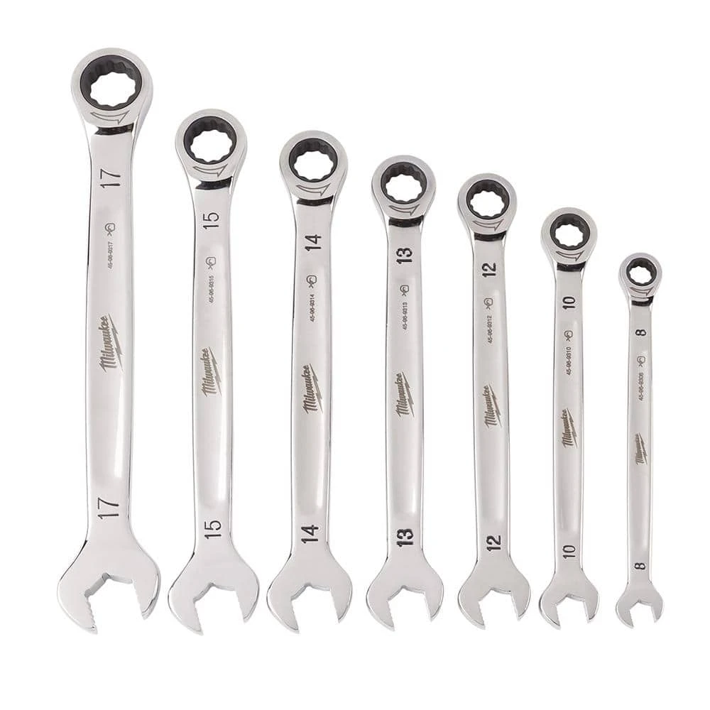 - 48-22-9406 and 48-22-9506: includes: one 8 mm ratcheting combination wrench, one 10 mm ratcheting combination wrench, one 12 mm ratcheting combination wrench, one 13 mm ratcheting combination wrench, one 14 mm ratcheting combination wrench, one 15 mm ratcheting combination wrench, one 17 mm ratcheting combination wrench