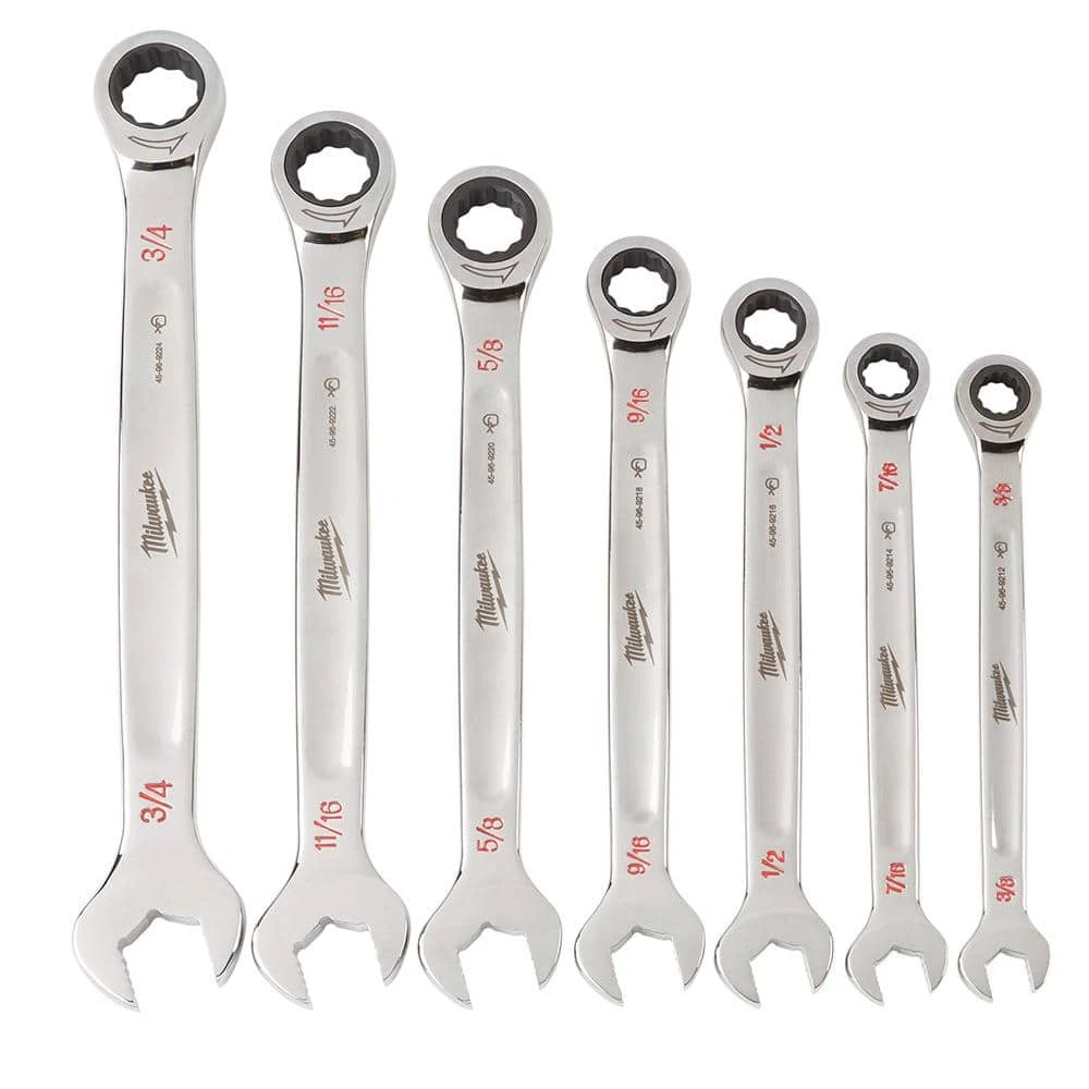 The Milwaukee 56-Piece 3/8 in. Drive Ratchet and Socket Set offers better access in tight spaces and maximum tool strength. The 90-tooth ratchet tool offers 4° of arc swing and a slim profile design. The innovative, wrench-compatible socket design has 4 parallel flats to help prevent rolling. Optimized socket geometry additionally helps reduce bolt rounding and stripping. Find each socket size stamped into the flats for easy-to-read visibility. This kit includes a removable inner tray and is designed to be stored long-term in a steel storage chest. It also comes with a durable carrying case for ultimate portability. The Milwaukee Ratcheting Combination Wrenches feature 2.5° of arc swing, allowing quick and efficient work. These mechanic’s wrenches feature durable double-stacked pawls in the ratcheting mechanism, offering the longest ratchet life and improved access with 144 ratcheting positions. MAX BITE Open-End Grip improves the ratchet wrench’s grip on nuts and bolts, offering 25% more torque than smooth-faced wrenches. Each combination wrench features an ergonomic I-Beam handle design for improved comfort. The ratcheting combination wrench set features ink-filled size labels for easy size identification, as well as quick distinction between SAE and metric sets. The 7-piece metric ratcheting combination wrench set comes in a portable locking storage tray, offering organization both on and off the jobsite. These Milwaukee Mechanics Sets feature a Lifetime Guarantee.