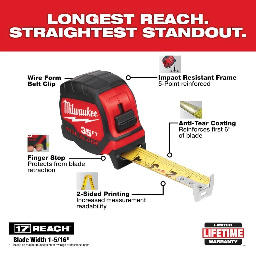 The Milwaukee 35 ft. Wide Blade Tape Measures have the longest reach and straightest standout in the industry. Users can reach further on the jobsite with up to 16 ft. of reach to take long measurements on their own. The Milwaukee blade design provides the straightest standout, reducing blade arc for efficient and accurate measuring. The tape measures are wear and impact-resistant with nylon bond blade protection and an additional anti-tear coating on the first 6 in. of the blade, reducing tape tear. Built to withstand the jobsite, the measuring tapes are constructed with a 5-point reinforced frame for impact resistance.