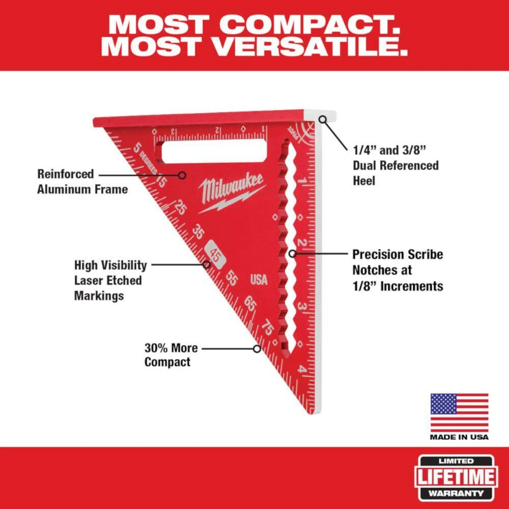 The Milwaukee 40 ft. W Blade Tape Measures have the longest reach and straightest standout in the industry. Users can reach further on the jobsite with up to 17 ft. of reach to take long measurements on their own. The Milwaukee blade design provides the straightest standout, reducing blade arc for efficient and accurate measuring. The tape measures are wear and impact-resistant with nylon bond blade protection and an additional anti-tear coating on the first 6 in. of the blade, reducing tape tear. Built to withstand the jobsite, the measuring tapes are constructed with a 5-point reinforced frame for impact resistance. The Milwaukee 4-1/2 in. Trim Square is an everyday carry layout solution. The Milwaukee Compact Speed Square is 35% smaller in size to easily fit into tight work spaces as well as the user’s pockets and pouches. High visibility laser etched markings will not wear off after heavy use, providing users with consistent high visibility throughout the life of the square. A 1/4 in. and 3/8 in. dual measurement heel also enables users to perform quick marks. The trim speed square is backed by a Milwaukee Limited Lifetime Warranty.