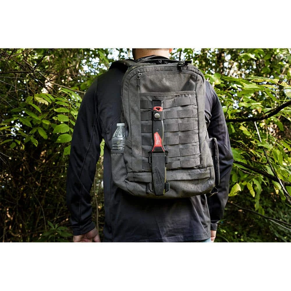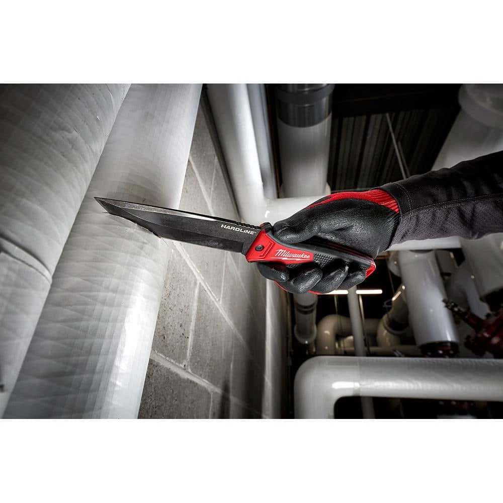 Experience the uncompromising performance of this 5-in. Milwaukee HARDLINE knife, which features an AUS-8 steel blade with a full tang to deliver unmatched durability. A great choice for tough cuts, this knife is crafted with an overmolded handle to provide a strong, secure grip. A multi-position sheath enables multiple carry options. It can be mounted vertically or horizontally on belts and mounting systems.