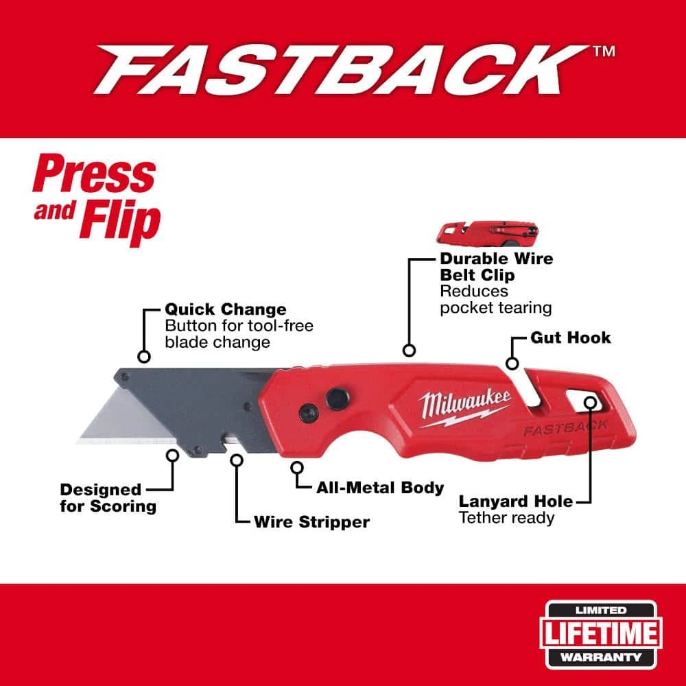 The Milwaukee FASTBACK Folding Utility Knife features a press and flip mechanism for easy, 1-handed opening. The Milwaukee FASTBACK Folding Utility Knife allows users to make quick, tool-free blade changes for maximum jobsite efficiency. The utility knife has an all metal body, an integrated gut hook and wire stripper for increased versatility. The folding utility knife is equipped with a durable wire belt clip to reduce pocket tearing and a blade holder designed for scoring. The knife has a lanyard hole for safe convenient tethering.