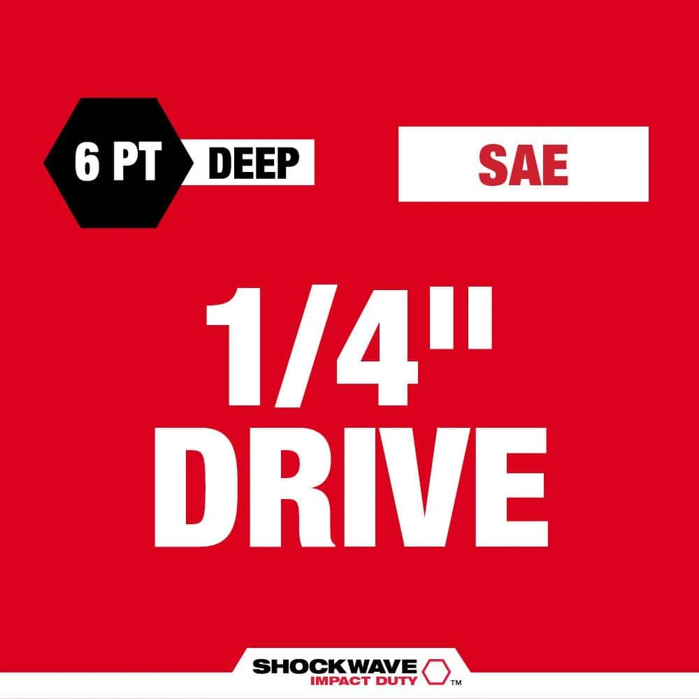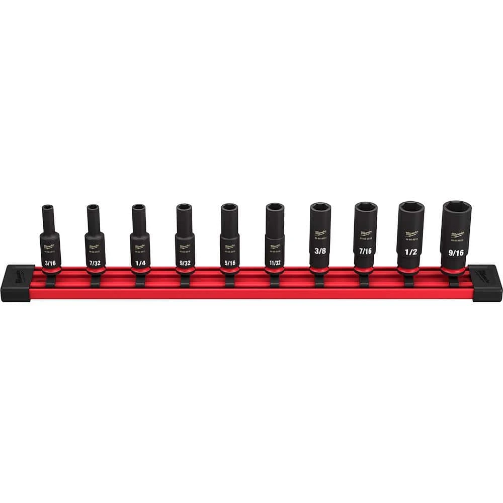 The Milwaukee 10-Piece SHOCKWAVE Impact Duty 1/4 in Drive SAE Deep 6 Point Socket Set features the boldest, longest-lasting markings and extreme impact durability in high torque applications. The stamped and ink-filled size marking enables users to select the right socket every time throughout the life of the socket. These Milwaukee sockets are engineered with high strength forged steel for optimized performance in heavy-duty applications. The non-slip hex geometry prevents fastener rounding, and a dual-hole design and ring groove allow for easy socket attachment and removal. The customizable Socket Rail comes with removeable end caps to add or take off socket clips for optimal storage. All SHOCKWAVE Impact Duty Sockets backed by a Lifetime Guarantee and meet ASME industry standards.