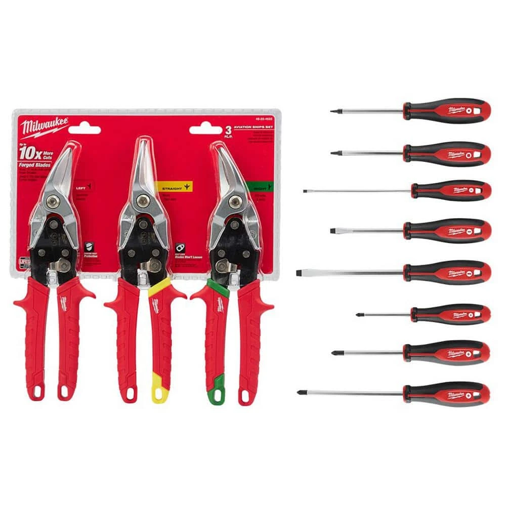 Milwaukee aviation snips are built for long-life and durability. Forged blades deliver up to 10X more cuts than cast blades. Bolt lock ensures the blades won’t loosen and chrome plating provides rust protection. The flush pivot bolt won’t hang up on material for easy use. The metal lock secures the tool for storage and is easily operated with 1-hand. The 3-piece set includes left, right, and straight aviation snips. Milwaukee 8-piece screwdriver set provides professional grade solutions and durability to the user. Bit types are marked on the cap of each tool for quick identification and increased efficiency. The comfortable tri-lobe handle allows users to comfortably apply more leverage.
