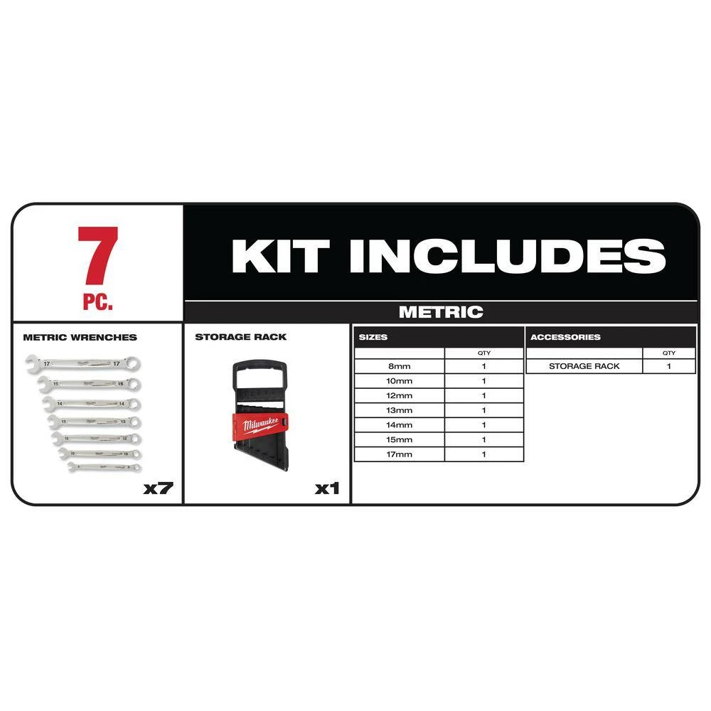 - 48-22-9507 includes: combination metric wrench mechanics tool set (7-Piece) with 8 mm, 10 mm, 12 mm, 13 mm, 14 mm, 15 mm, 17 mm wrenches