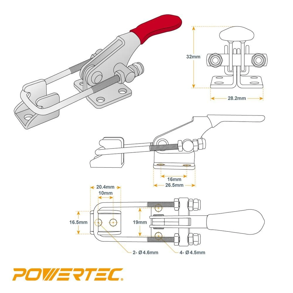 Designed, constructed and rigorously tested to meet your most demanding workshop requirements, the POWERTEC Latch-Action Toggle Clamp provides the secure, straight-pulling action that is essential in a multitude of woodworking, automotive, construction and home-based projects. Its sturdy, non-distorting hold ensures the protection and/or attachment of your valuables, allowing you to focus on getting things done quickly and with ease. Vinyl colored grip for easy identification and comfort. Zinc-plated coating for corrosion resistance. Featuring both strength and adjustability with its elegantly designed and streamlined latch-mechanism, this handy accessory will make your work on medium-duty woodworking and construction projects, a breeze. Ideal for use on doors, machinery, automobiles, jig assemblies and other medium to heavy-duty job applications. Clamp base: 1 in. x 1-1/8 in. Mounting holes: 3/16 in. spaced 5/8 in. x 13/16 in. apart. Latch pate: 7/16 in. x 13/16 in. Mounting holes: 3/16 in. spaced 3/8 in. 1/8 in. U bolt: 1 in. x 2-3/4 in. Threaded U bolt adjusts 1-1/8 in. Clamp height when clamped: 1-1/4 in. Total length range, including handle, when clamped: 3-7/8 in. – 5 in.