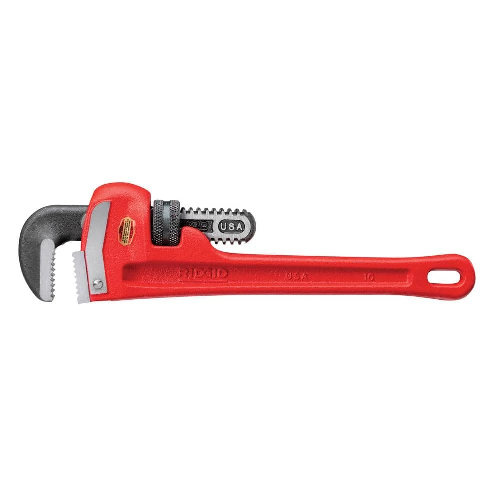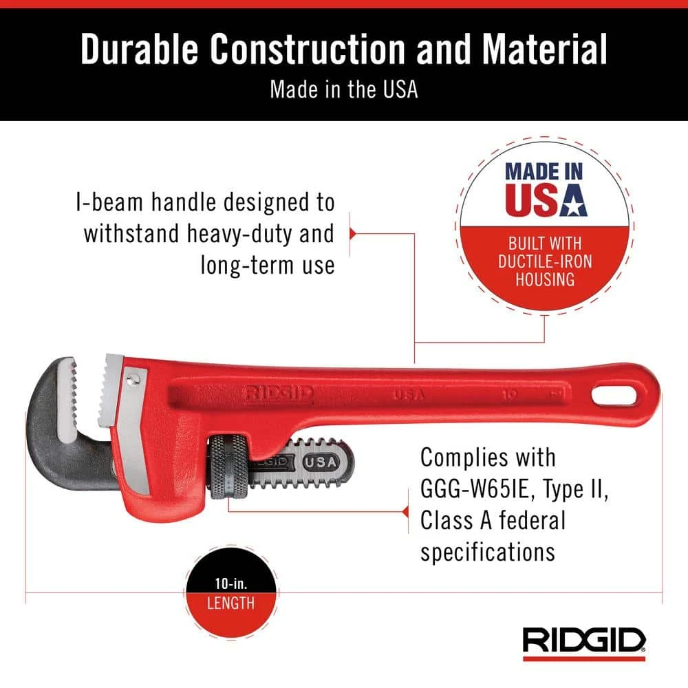 Experience strength and durability with a wrench unlike any other, the 10 in. RIDGID Heavy-Duty Straight Pipe Wrench (catalog number 31010, model 10). Built to perform in the harshest jobsite conditions, this USA made 10 in. wrench accommodates all forms of pipe work with a pipe capacity up to 1-1/2 in. The full-floating forged alloy steel hook jaw provides maximum gripping power and quick ratcheting action to confidently grip and turn pipe. The wrench features convenient self-cleaning threads as well as easily and quickly replaceable hook and heel jaws, and spring assemblies. Constructed with ductile-iron housing and an easy to hold I-beam handle, it provides long-lasting strength and durability that can withstand heavy-duty and long-term use. This standout red-colored wrench is easy to locate in your toolbox and complies with GGG-W65IE, Type II, and Class A federal specifications.