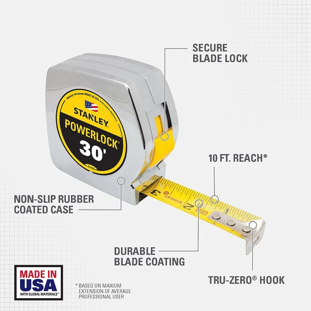Get the durability and dependability you need with this 30 ft. PowerLock Tape Measure with BladeArmor. Draw circles and arcs and easily frame a wall using the 16 in. and 19-1/5 in. stud center markings while the Tru-Zero end hook helps deliver reliable accuracy. The Mylar-coated blade resists wear-and-tear for long life and the blade lock keeps the tape measure securely in place as you work.